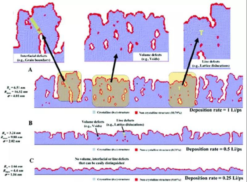 圖2. 分子動(dòng)力學(xué)模擬的不同結(jié)晶速度下鋰金屬的沉積形態(tài)。更快的結(jié)晶速度(A.)導(dǎo)致了內(nèi)部缺陷空間的形成,而較低的沉積速率(B.C.)則有著更好的沉積形貌。