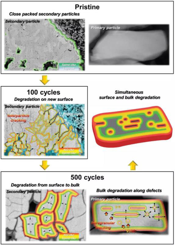 高Ni NCM電極結(jié)構(gòu)改變:二次NCM顆粒由密堆積的一次顆粒和缺陷組成,反復(fù)循環(huán)會引起一次顆粒之間的破裂,而新的一次顆粒之間的裸露裂紋和某些缺陷會導(dǎo)致電解液連續(xù)滲透。結(jié)果,由于一次顆粒中的裂紋或缺陷,降解從新暴露的表面繼續(xù)開始,逐漸傳播并加速進(jìn)入一次顆粒中。最后,從一次粒子的表面以及二次粒子的表面開始,高Ni NCM正極的降解會繼續(xù)進(jìn)行,并擴散到大面積區(qū)域,導(dǎo)致整個電極的破壞。
