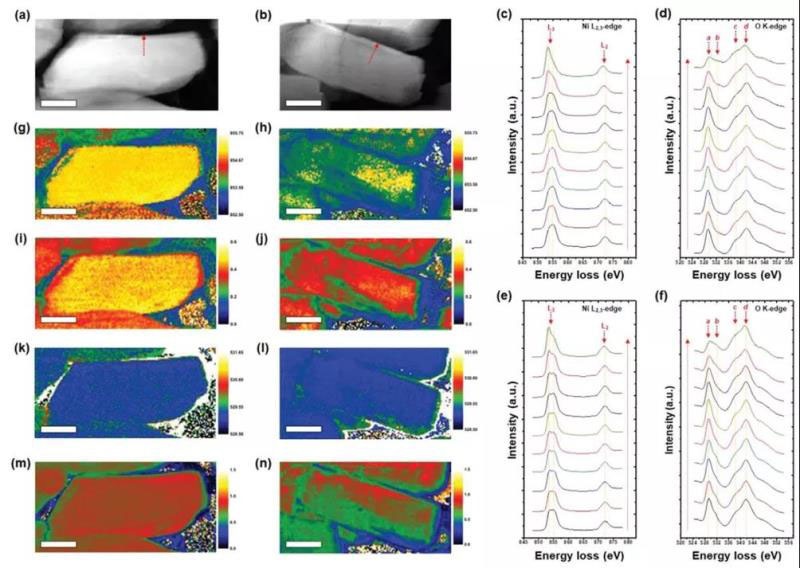 圖6. HAADF和EELS表征,能量散射強度圖(g, h)Ni M L3(i, j)Ni M L2峰/M L3峰強度比、(k, l)O K a、(m, n)O-K a峰和b峰強度比