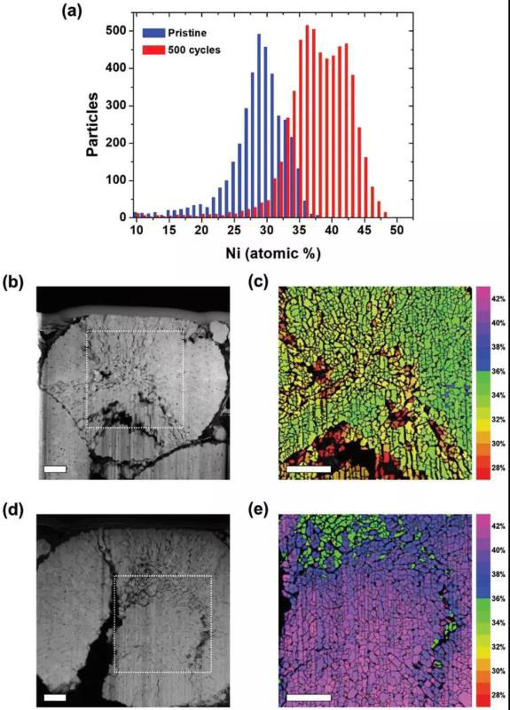 電子損耗近邊結(jié)構(gòu)分析整個顆粒的變化:電子損耗近邊結(jié)構(gòu)(ELNES)與NEXAFS相比具有更好的空間分辨率,并且對表面狀態(tài)的敏感性較低,能夠?qū)φ麄€顆粒進(jìn)行深度表征,彌補TEM近表面分析的不足。通過原始樣品和500次循環(huán)后NCM一次顆粒的Ni L2,3邊和O K邊的ELNES光譜變化確定顆粒成分的變化。(1)在500次循環(huán)后從內(nèi)部到表面的變化過程中Ni2+的含量逐漸增加,對應(yīng)NiO相在表面的形成。(2)同時隨著充放電的進(jìn)行,結(jié)構(gòu)損壞從表面逐漸擴散至內(nèi)部并導(dǎo)致整個顆粒的失效。