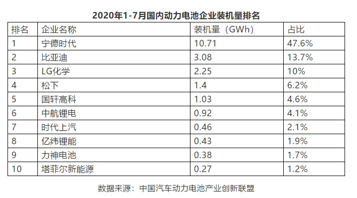 中國汽車動力電池產(chǎn)業(yè)創(chuàng)新聯(lián)盟數(shù)據(jù)顯示,在2020年1-7月國內(nèi)帶來的企業(yè)裝機(jī)量排名中,LG化學(xué)和松下分列三、四名,僅次于寧德時代和比亞迪。