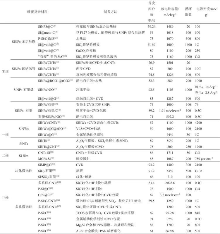表1 典型的硅碳復(fù)合材料及其制備方法和電化學(xué)性能總結(jié)