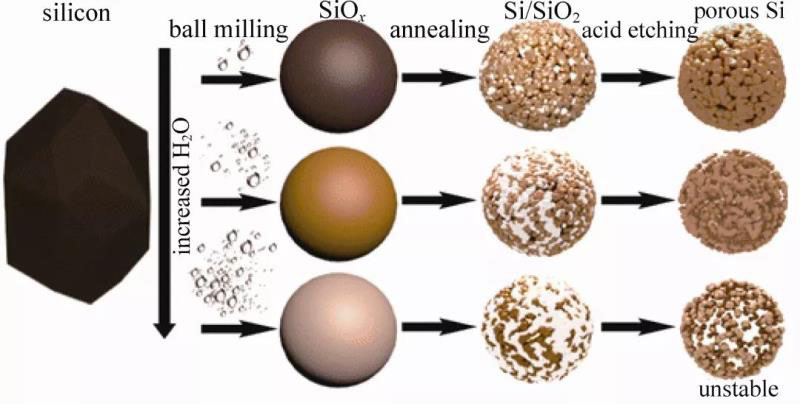塊狀微米硅擁有高的壓實(shí)密度和體積比容量,但是由于其顆粒尺寸過大,顆粒更容易破裂粉化,離子的擴(kuò)散距離也更長(zhǎng),導(dǎo)致庫侖效率低,容量衰減快,而納米硅材料的顆粒尺寸小,可有效緩解體積膨脹,縮短粒子的傳輸路徑。多孔微米硅的一次顆粒為納米尺寸,可以有效避免塊狀微米硅的各種缺點(diǎn),而其二次顆粒的微米尺寸又能保證硅的高壓實(shí)密度和體積比容量。目前,制備多孔微米硅的方法主要有:SiOx歧化、鎂熱還原反應(yīng)、金屬輔助刻蝕法(MACE)和硅基金屬合金刻蝕等。
