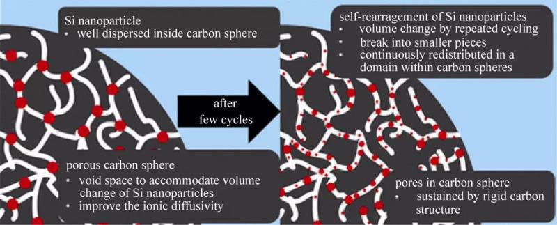 從目前研究來看,將硅顆粒尺寸降低到納米量級(jí)能有效抑制硅在循環(huán)過程中因體積膨脹而造成的粉化和電脫離,改善循環(huán)性能。但是納米材料具有非常大的比表面積,與電解液接觸時(shí)易發(fā)生不可逆副反應(yīng)消耗大量鋰鹽形成SEI膜,導(dǎo)致庫侖效率降低和容量衰減。尤其是當(dāng)硅含量較高時(shí),上述問題將更加嚴(yán)重。通過納/微結(jié)構(gòu)設(shè)計(jì),降低納米硅/碳的比表面積,并緩解硅的電化學(xué)應(yīng)力,有望得到高首效和長(zhǎng)循環(huán)的硅/碳復(fù)合材料。