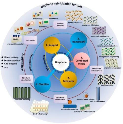 圖1. 石墨烯與硅及其他高容量儲(chǔ)能電極材料的雜化方法和策略