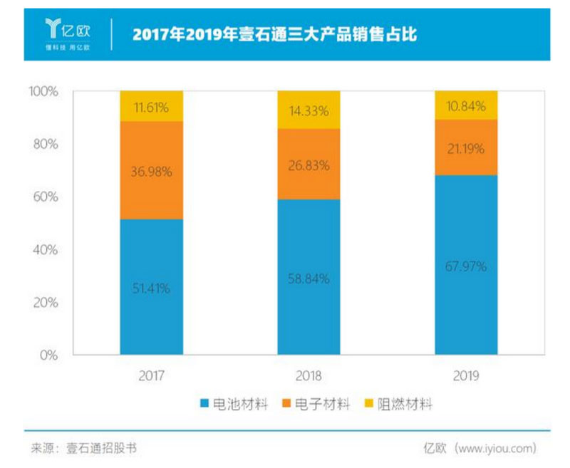 現(xiàn)階段,壹石通主營產(chǎn)品主要是電池材料、電子材料和阻燃材料三大類,其中電池材料貢獻最大。2017 年至 2019 年,壹石通電池材料銷售收入快速增長,分別為 3,874.77 萬元、6,798.04萬元和 11,222.36 萬元,占營業(yè)收入的比重分別為51.41%、58.84%和 67.97%;而電子材料和阻燃材料這兩類產(chǎn)品的銷售收入則處于穩(wěn)定狀態(tài)。