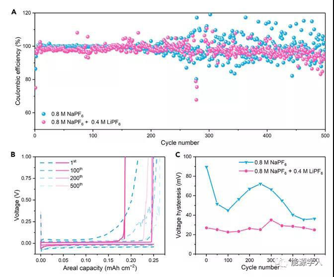 進(jìn)一步進(jìn)行電化學(xué)測試,以證明鋰離子添加劑在鈉金屬電池中的實際性能。結(jié)果顯示,使用Li+添加劑,可以顯著提高200次循環(huán)后的庫侖效率。更重要的是,Li+添加劑可顯著降低電壓滯后。此外,Li+添加劑對Na剝離行為也有明顯影響。