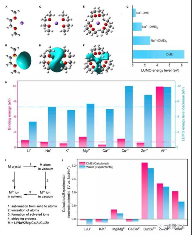 考慮到陽離子添加劑的電極電位應(yīng)低于鈉金屬負(fù)極,作者建議使用Li+、K+和Ca2+。綜合考慮到LUMO能級的降低和結(jié)合能,Li+是最佳的候選元素。鋰離子的電極電位是-0.08 V vs Na/Na+,若添加劑的濃度比實際電池中的工作離子小得多,該電位幾乎不會變正。此外,Li+與DME分子的結(jié)合能比Na+大,不易脫溶劑化。因此,鋰離子不能在鈉金屬負(fù)極上還原。更重要的是,Li+對DME的LUMO水平降低比Na+小,可以穩(wěn)定電解質(zhì)溶液。