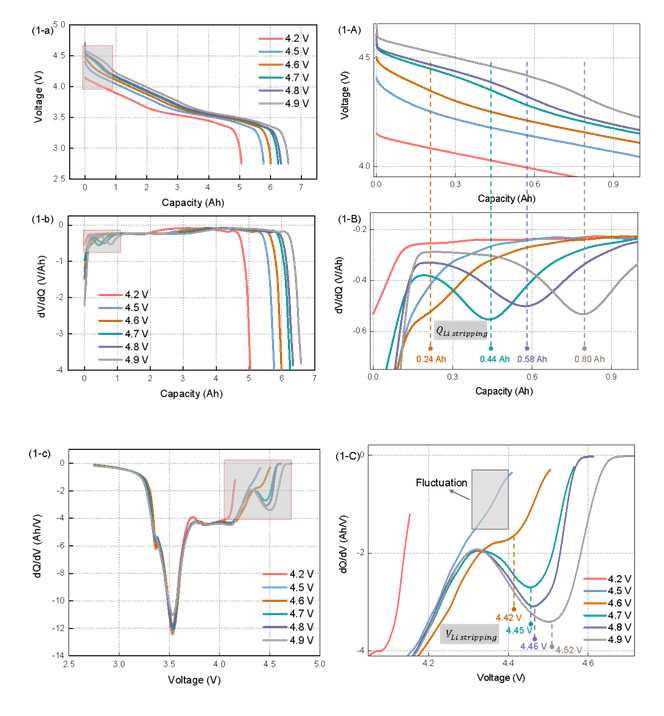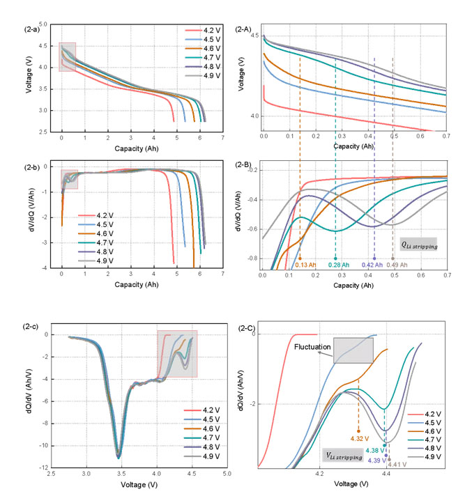 圖 1展示了在0.2 C和0.5 C放電4.2 V,4.5-4.9V下,電壓與容量的關(guān)系、差分電壓和差分容量的結(jié)果。以0.5 C為例進(jìn)行分析:從圖 1(2-a/A)中可以看出,4.7 V,4.8 V和4.9 V三個(gè)過充截止電壓下在放電初期出現(xiàn)了一段高電壓平臺(tái),我們認(rèn)為是鋰溶解電壓平臺(tái),對(duì)放電曲線進(jìn)行差分電壓和差分容量,如果二者出現(xiàn)極小值,則說明發(fā)生析鋰。