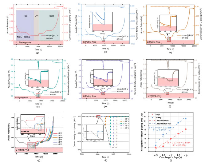 (g)–(h): 各個(gè)電壓下負(fù)極-隔膜界面的負(fù)極電位(g)和析鋰電流密度(h) ((a)–(f)的總結(jié));