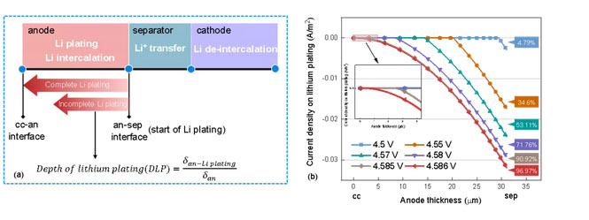 (b):0.5C時(shí)負(fù)極厚度方向的析鋰電流密度以表征不完全析鋰的電壓區(qū)間,以及計(jì)算的DLP。