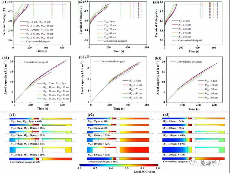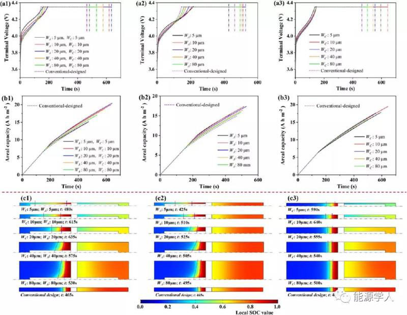 電解液通道寬度的影響。同時(shí)存在陰、陽極通道的電池,當(dāng)WEA和WEC均為10μm時(shí),出現(xiàn)最大CCCV充電時(shí)間(圖6a1),對應(yīng)最大面容量(圖6b1)。只有一個(gè)電極有通道時(shí),當(dāng)WEA =10μm或WEC=20μm時(shí),出現(xiàn)最大CCCV充電時(shí)間(圖6a2和6a3),對應(yīng)面積容量的最大值(圖6b2,6b3)。陰/陽極同時(shí)具有電解液通道的電池,適當(dāng)?shù)耐ǖ缹挾龋╓EA和WEC)可以使陽極材料的SOC分布更加均勻(圖6c1)。對于陰極而言,當(dāng)WEA和WEC超過20μm時(shí),不利于Li+脫出。