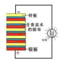 伏打最開始用幾只碗盛了鹽水,把幾對黃銅和鋅做成的電極連接起來,就產(chǎn)生了電流。之后他用更多的銅片和鋅片接觸,并且用相同數(shù)目的水層或比純水更好的導(dǎo)電液體層(食鹽、堿水)或皮革等海綿狀的物體間隔開,這樣一來,每一節(jié)原電池有一塊銅片和一塊鋅片用作電極,它們之間是一片浸過鹽水的布,作為電解質(zhì)。每個(gè)原電池有一個(gè)小的電動勢,而后伏打發(fā)現(xiàn),把這些原電池疊起就會有一個(gè)大的電動勢。并且原電池的一端帶正電,另一端帶負(fù)電,由此構(gòu)成一個(gè)電流回路。