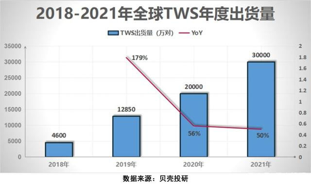 據(jù)行業(yè)數(shù)據(jù)顯示,2019年TWS市場高增,全年全球TWS出貨1.29億臺,同比增長179%,預計2020年出貨2億臺,同比增長56%。