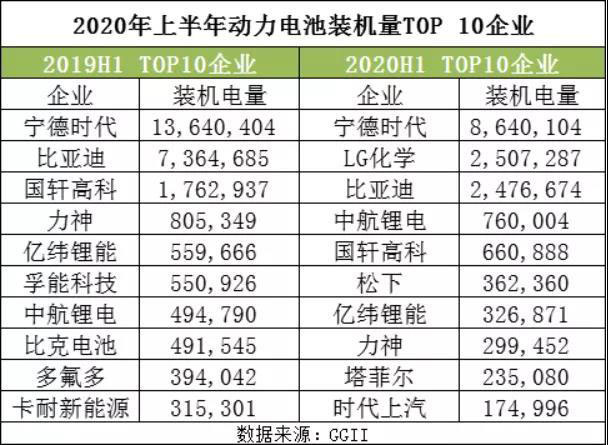 上半年裝機(jī)量TOP 10企業(yè)依次為寧德時(shí)代、LG化學(xué)、比亞迪、中航鋰電、國(guó)軒高科、松下、億緯鋰能、力神、塔菲爾、時(shí)代上汽。
