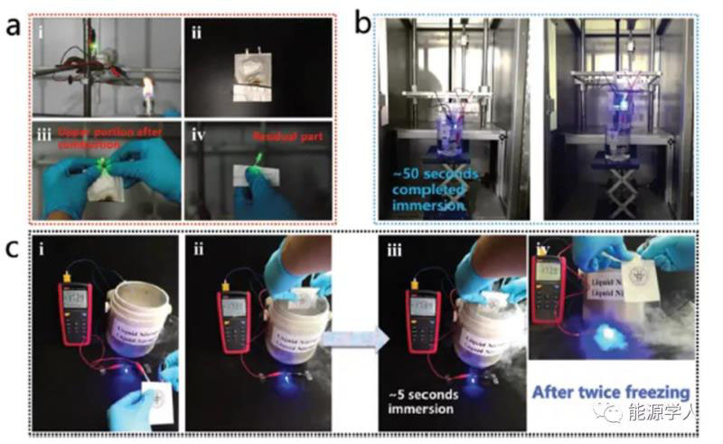 雙層異質(zhì)復(fù)合固態(tài)電解質(zhì)的使用極大地改善了電池的使用安全性,在經(jīng)歷如釘穿、對(duì)折以及剪切等濫用性實(shí)驗(yàn)后電池未發(fā)生過熱、燃燒等情況且仍能為用電器件進(jìn)行供能(圖5d,e)。得益于聚合物基質(zhì)的不燃性、凝膠中的阻燃添加劑以及無(wú)機(jī)材料優(yōu)良的熱穩(wěn)定性,使用雙層異質(zhì)復(fù)合固態(tài)電解質(zhì)所組裝的軟包電池展現(xiàn)出良好的高溫安全性、水下短路穩(wěn)定性以及極端低溫(液氮)環(huán)境中的耐受性(圖6)。