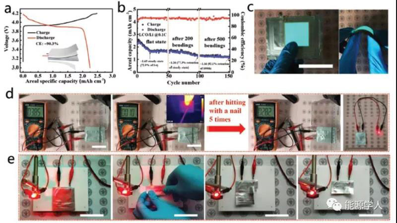 圖5. LiCoO2/PMLSE/Li軟包電池的柔性應(yīng)用和安全評(píng)估