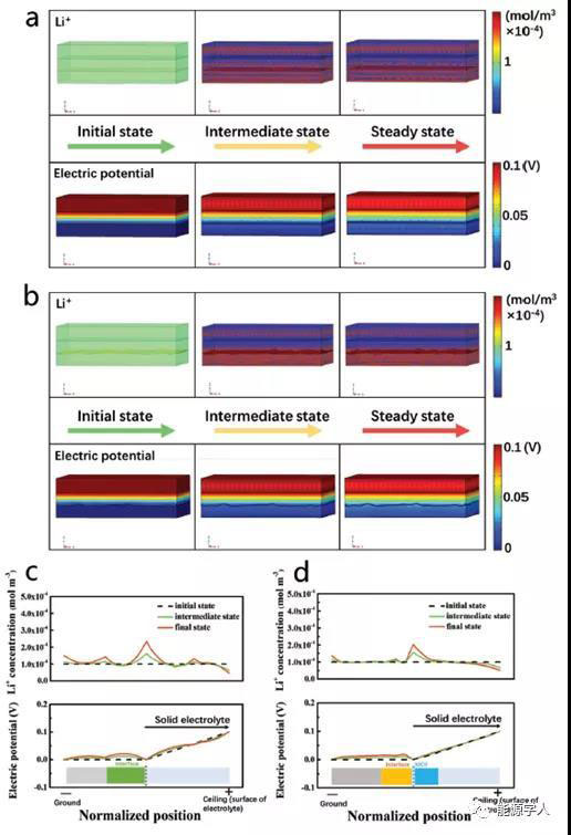 為了進(jìn)一步探究PLSE的失效機(jī)制(相較于PMLSE),基于有限元分析,我們利用COMSOL對(duì)使用兩種電解質(zhì)電池中的多物理場(chǎng)進(jìn)行了模擬(圖3)。當(dāng)PLSE作為固態(tài)電解質(zhì)時(shí),聚合物成分仍舊是離子傳導(dǎo)的主體,盡管固態(tài)電解質(zhì)有很高的體離子電導(dǎo)率,但在界面處的固-固傳質(zhì)過程仍存在巨大的勢(shì)壘,這會(huì)導(dǎo)致界面處極易出現(xiàn)離子濃差極化以及離子的不均勻沉積,由此所引發(fā)的過高的極化電壓會(huì)導(dǎo)致電池內(nèi)部電勢(shì)失衡,最終使得電池失效。在引入含有MOF的高離子導(dǎo)復(fù)合凝膠層后,界面離子傳輸勢(shì)壘減小,同時(shí)MOF的孔道會(huì)調(diào)控離子束流高效的均勻沉積,實(shí)現(xiàn)電勢(shì)的均勻分布,而均勻分布的電勢(shì)又會(huì)進(jìn)一步誘導(dǎo)鋰離子的均勻沉積,最終在界面處和電池內(nèi)部整體實(shí)現(xiàn)良性的循環(huán),保證電池的穩(wěn)定循環(huán)。