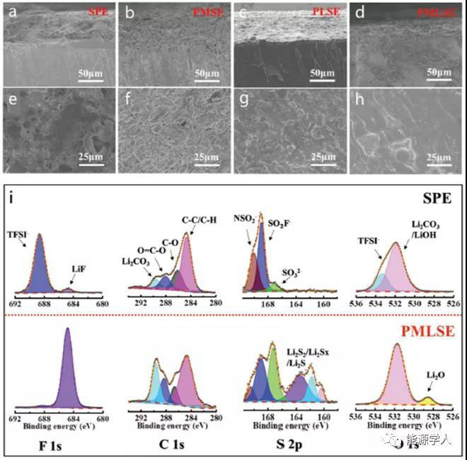 通過對(duì)比使用不同種類固態(tài)電解質(zhì)所組裝的Li/Li對(duì)稱電池的循環(huán)性能,功能性無(wú)機(jī)填料的加入可以明顯地提升聚合物固態(tài)電解質(zhì)的電化學(xué)穩(wěn)定性。但對(duì)于長(zhǎng)期的循環(huán)穩(wěn)定性而言,由于PMSE機(jī)械性能的不足導(dǎo)致了Li/Li對(duì)稱電池最終還是出現(xiàn)了短路的現(xiàn)象,使用力學(xué)性能更為優(yōu)異的PLSE所組裝的電池同樣也出現(xiàn)了過度極化的失效機(jī)制,這意味著復(fù)合凝膠層在改善PLSE的界面電化學(xué)穩(wěn)定性方面有著明顯的作用。拆解觀察循環(huán)后鋰金屬的形貌可以看出使用PMLSE雙層電解質(zhì)的對(duì)稱電池中的鋰金屬負(fù)極表面更為致密平整(圖2)。通過XPS分析可以得知,PMLSE電解質(zhì)相較于SPE而言,更加有利于促進(jìn)以LiF和有機(jī)-無(wú)機(jī)硫化物為主導(dǎo)成分的SEI層的形成。