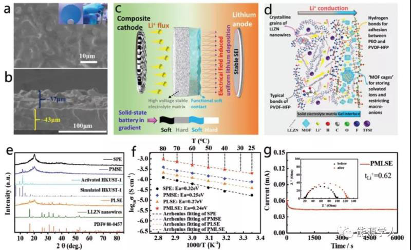 為了提高聚合物電解質(zhì)的離子傳導(dǎo)特性和整體的電化學(xué)穩(wěn)定性,首先通過靜電紡絲技術(shù)和合理的煅燒制度制備了具有高長(zhǎng)徑比的一維石榴石(Li6.75La3Zr1.75Nb0.25O12,LLZN)納米線,并將其作為填料引入至PVDF-HFP/LiTFSI體系中得到力學(xué)性能、電化學(xué)性能優(yōu)良的復(fù)合固態(tài)電解質(zhì)(PLSE);其次對(duì)PSLE進(jìn)行表面改性后作為基體,通過刮涂的方法將含有MOF(微米-納米復(fù)合尺度的HKUST-1)的復(fù)合凝膠層置于其表面;最后在手套箱內(nèi)烘干即得雙層異質(zhì)結(jié)構(gòu)的復(fù)合固態(tài)電解質(zhì)(PMLSE),如圖1a,b所示?;趶?fù)合正極材料(PEO/鋰鹽改性的正極)和復(fù)合凝膠層,固態(tài)電池內(nèi)部的固-固界面實(shí)現(xiàn)了軟接觸。PVDF-HFP/LLZN納米線固態(tài)電解質(zhì)基體可以很好地兼容高壓正極,復(fù)合凝膠層中的高濃度鋰鹽和MOF所具有的天然孔道促進(jìn)了電解質(zhì)-電極界面層(SEI)的快速穩(wěn)定形成,誘導(dǎo)了界面處鋰離子的均勻沉積(圖1c,d)。由于兩種功能無(wú)機(jī)材料的協(xié)同效應(yīng),作為對(duì)比,PMLSE相較于PVDF-HFP/LiTFSI(SPE)聚合物電解質(zhì)、PLSE以及PVDF-HFP/MOF(PMSE)兩種復(fù)合固態(tài)電解質(zhì)在鋰離子傳輸效率(電導(dǎo)率和鋰離子遷移數(shù))上有了明顯提升(圖1e-g)。