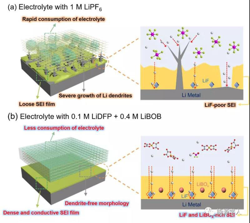以低濃度LiDFP-LiBOB雙鹽電解液為例,如圖7所示,通過(guò)富含LiF和LiBOx組分的SEI膜調(diào)控,在鋰金屬表面構(gòu)筑致密、高穩(wěn)定性SEI膜,一方面抑制了鋰枝晶的生長(zhǎng),另一方面減少了電解液在循環(huán)過(guò)程中的消耗,保證了低濃度電解液也在鋰金屬電池中良好的綜合性能表現(xiàn)。