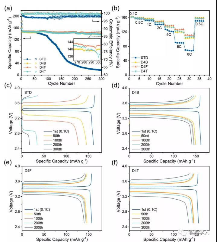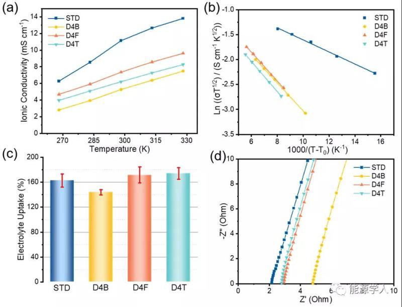 如圖2a所示,雙鹽電解液0.1 M LiDFP + 0.4 MLiBOB/LiFSI/LiTFSI由于較少的陰陽(yáng)離子數(shù)量,表現(xiàn)出比常規(guī)電解液1 M LiPF6/EC + DMC (3:7, wt) 具有較低的電導(dǎo)率。以常溫為例,LiDFP-LiBOB (D4B)電解液的電導(dǎo)率為5.27 mS/cm, 雖然不足常規(guī)電解液STD(11.14 mS/cm)的一半,但高于大多數(shù)高濃電解液的電導(dǎo)率,LiDFP-LiFSI(D4F)和LiDFP-LiTFSI (D4T)電解液的電導(dǎo)率比LiDFP-LiBOB更高,分別為7.35和6.21 mS/cm。和常規(guī)電解液一樣,低濃電解液的電導(dǎo)率與溫度依賴關(guān)系符合Vogel–Tamann–Fulcher(VTF)方程(圖2b)。