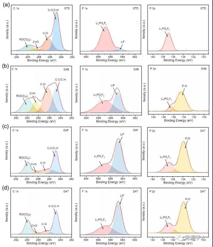 圖4. 不同電解液中循環(huán)后鋰金屬表面SEI膜的化學(xué)組分分析