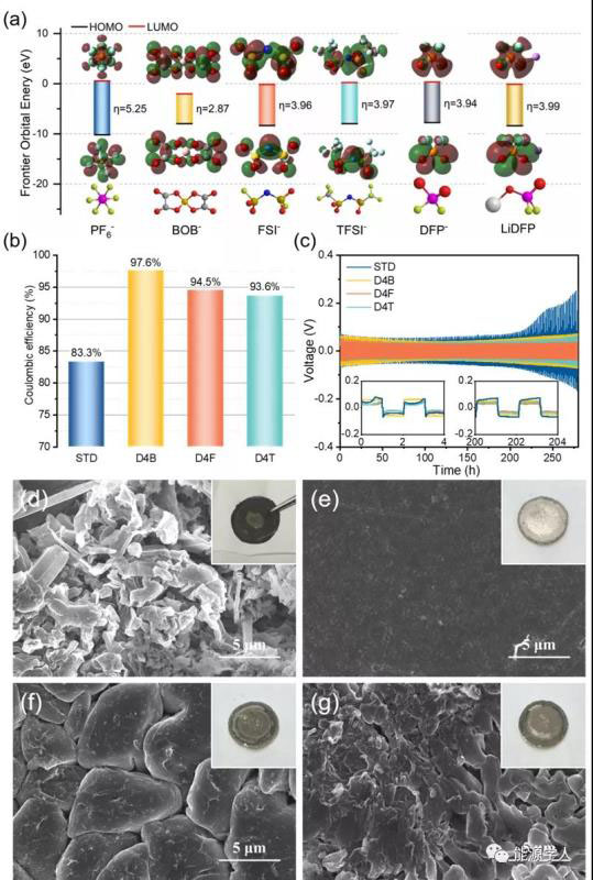 圖3 對(duì)不同鋰鹽分子化學(xué)性質(zhì)的計(jì)算及不同電解液對(duì)金屬鋰負(fù)極的兼容性