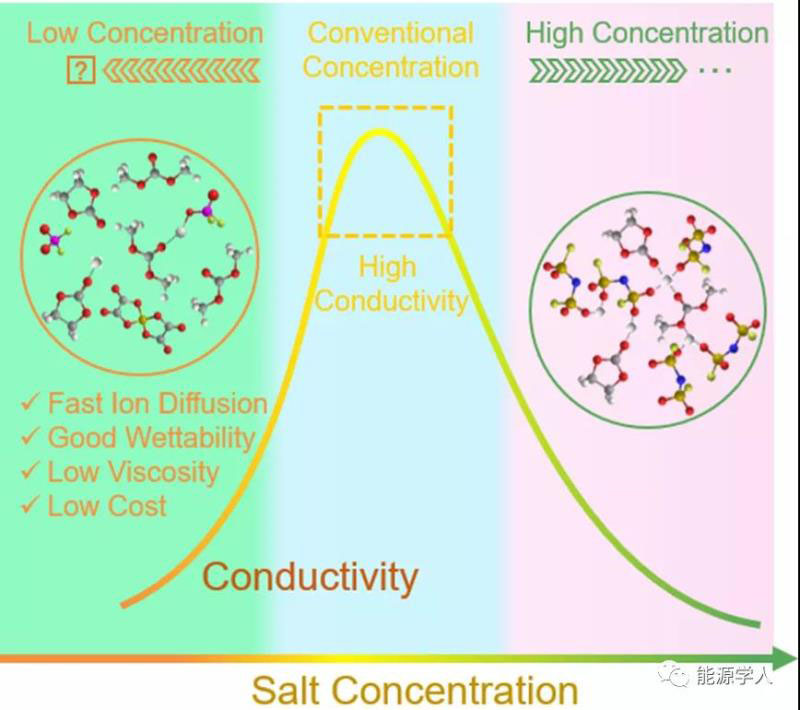 基于電解液組分設(shè)計(jì)的鋰枝晶抑制策略近年來(lái)受到了重視,高濃電解液由于特殊的溶劑化結(jié)構(gòu)具有優(yōu)異的界面穩(wěn)定性,在抑制鋰枝晶生產(chǎn)方面表現(xiàn)出良好的效果。項(xiàng)宏發(fā)團(tuán)隊(duì)曾報(bào)道了5M LiFSI/TMP不燃電解液對(duì)鋰枝晶生長(zhǎng)有明顯的抑制效果(Chemical Communications, 2018, 54, 4453-4456),不過(guò)高濃電解液相對(duì)于常規(guī)濃度電解液(1.0~1.2M)顯著增大的粘度導(dǎo)致電導(dǎo)率的降低,但穩(wěn)定的SEI界面表現(xiàn)出高離子傳導(dǎo)特征,彌補(bǔ)了電解液本體電導(dǎo)率較低的缺點(diǎn),帶來(lái)鋰金屬電池良好的電池性能。低濃度電解液由于較低的鋰鹽濃度導(dǎo)致較少的陰陽(yáng)離子數(shù)量,也導(dǎo)致其相對(duì)常規(guī)電解液較低的電導(dǎo)率。從高濃電解液的研究思路獲得啟發(fā),基于電解液組分設(shè)計(jì)構(gòu)筑高穩(wěn)定界面,在理論上完全可以通過(guò)提高界面穩(wěn)定性和離子傳導(dǎo)彌補(bǔ)其本體電導(dǎo)率不高的缺點(diǎn),進(jìn)而設(shè)計(jì)適用于鋰金屬電池的低濃度電解液。