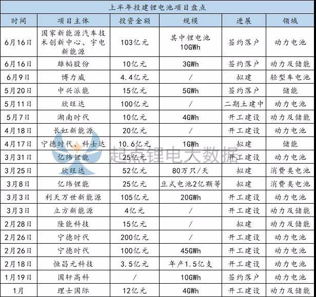 據(jù)起點(diǎn)鋰電大數(shù)據(jù)不完全統(tǒng)計(jì),今年上半年超過20個(gè)鋰電池項(xiàng)目落地或投產(chǎn),涉及投資金額超過810億元,包括動(dòng)力電池、消費(fèi)類電池、儲能電池等,具體如下: