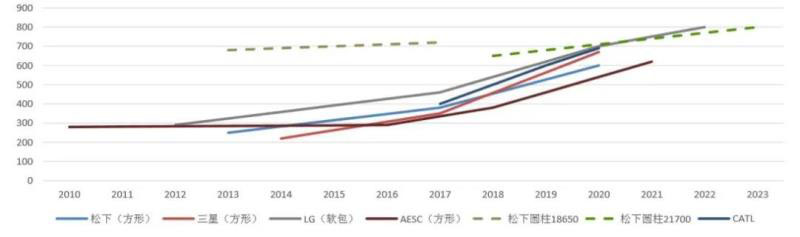 松下:松下與特斯拉深度綁定,最早采用鎳鈷鋁酸鋰(NCA)高鎳材料體系,主要以圓柱電池為主,目前產(chǎn)品由18650向21700轉(zhuǎn)變,并實現(xiàn)了供貨。目前電芯的能量密度已經(jīng)超過300Wh/kg,電池體系中采用了NCA和硅碳負極復(fù)合材料。另外松下?lián)碛蟹叫碗姵厣a(chǎn)能力,但是規(guī)模較小,主要產(chǎn)能在中國大連和日本Himeji。松下與豐田合作較為緊密,綁定也比較深,且計劃與豐田合作開發(fā)下一代固態(tài)鋰離子電池。