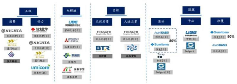 松下供應(yīng)鏈比較封閉主要選擇日系供應(yīng)商。由于松下正極材料主要為NCA正極材料,全部由住友金屬提供。國內(nèi)廈門鎢業(yè)主要為其提供鈷酸鋰和NCM正極材料,預(yù)計占比達到30%左右,杉杉科技和當升科技有望在未來進入其供應(yīng)鏈。負極材料方面人造石墨幾乎全部來源于日立化成獨家供應(yīng),天然石墨以日立化成和貝特瑞為主。電解液供應(yīng)格局同樣集中,日本宇部份額約65%,三菱化學的份額占比約為30%,其余部分分散在中國電解液廠。隔膜主要來源于國內(nèi)旭化成。