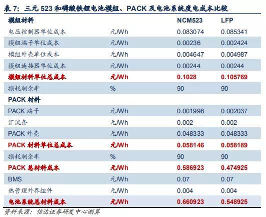 按照工藝順序電芯之后是模組和 PACK,其中模組材料包括電壓控制器、模組端子、模組外殼以及模組連接器,PACK 材料主 要包括 PACK 端子、匯流條和 PACK 外殼。據(jù)我們測算,三元 523 電池的模組材料和 PACK 材料度電成本分別為 102.8 和 58.15 元/ kWh,磷酸鐵鋰的分別為 105.77 和 58.19 元/ kWh。至此,我們已完成 PACK 總材料成本的測算,經(jīng)加總后得出三 元 523 和磷酸鐵鋰的 PACK 所有材料的總度電成本分別為 586.92 和 474.93 元/ kWh??紤]電池管理系統(tǒng)和熱管理組件成本 的情況下,我們測算得出目前三元 523 和磷酸鐵鋰電池系統(tǒng)材料總度電成本分別為 660.92 和 548.93 元/ kWh。