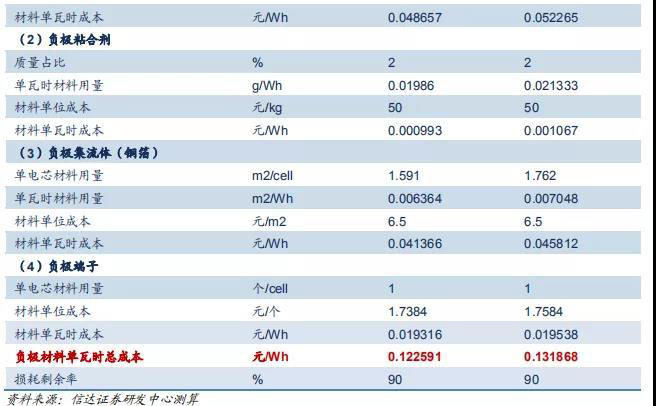 負極材料包括負極活性材料、負極粘合劑、負極集流體(銅箔)和負極組件負極端子。據(jù)我們測算,目前三元 523 負極活性 材料、粘合劑、銅箔、負極端子度電成本分別為 48.66、0.99、41.37、19.32 元/kWh,磷酸鐵鋰電池分別為 52.27、1.07、 45.81、19.54 元/kWh,負極材料中活性材料、銅箔和負極端子成本占比較高,粘合劑占比較低??紤]到材料損耗,我們測算 得出三元 523 負極材料度電總成本為 122.59 元/ kWh,磷酸鐵鋰負極材料度電總成本為 131.87 元/ kWh。由于能量密度的不 同以及其他材料接近的原因,磷酸鐵鋰電池的負極材料成本高于三元電池。