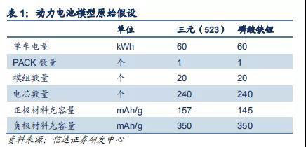 我們假設(shè)單車帶電量 60kWh,包括 1 個電池包,20 個模組和 240 個電芯,以上假設(shè)主要用于測算模組和 PACK 組件成本。 我們選取三元動力鋰電池 523 型和磷酸鐵鋰電池作為研究對象進行分析比較。參考當(dāng)升科技公告數(shù)據(jù),我們假設(shè)三元(523) 正極材料實際克容量為 157mAh/g。參考國軒高科和豐元股份公告數(shù)據(jù),目前國內(nèi)磷酸鐵鋰正極材料實際克容量基本已經(jīng)達到 150mAh/g,我們?nèi)?145mAh/g 的平均水平作為磷酸鐵鋰正極材料實際克容量假設(shè)。參考杉杉股份公告數(shù)據(jù),我們假設(shè)負極活 性材料(人造石墨)實際克容量為 350 mAh/g。