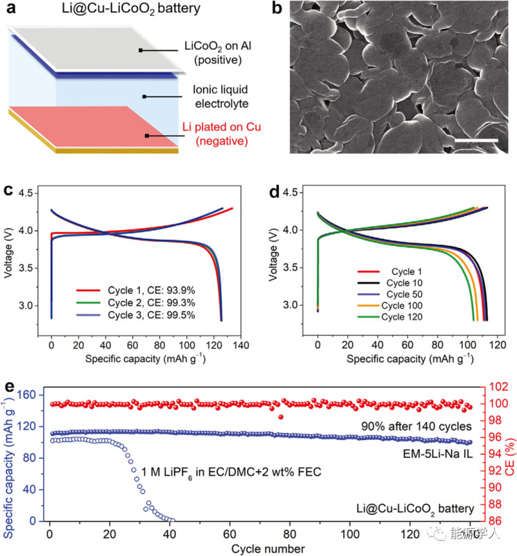 圖4 采用EM-5Li-Na IL電解液的Li@Cu-LiCoO2電池。a) Li@Cu-LiCoO2電池結(jié)構(gòu)示意圖,電池負極為沉積了一定量Li金屬的Cu箔。b)Cu表面沉積Li后(面容量:2 mAh cm?2)的表面形貌,比例尺:5 μm。c)采用 EM-5Li-Na IL電解液的Li@Cu - LiCoO2電池在0.25 C下的恒流充放電曲線。d) 采用 EM-5Li-Na IL電解液的Li@Cu-LiCoO2電池在0.7 C下的恒流充放電曲線。e)使用有機電解液和EM-5Li-Na IL電解液的Li@Cu -LiCoO2電池在0.7C下的循環(huán)穩(wěn)定性曲線。(c-e)中LiCoO2的載量為≈10 mg cm?2,所沉積Li金屬的容量約2倍過量。