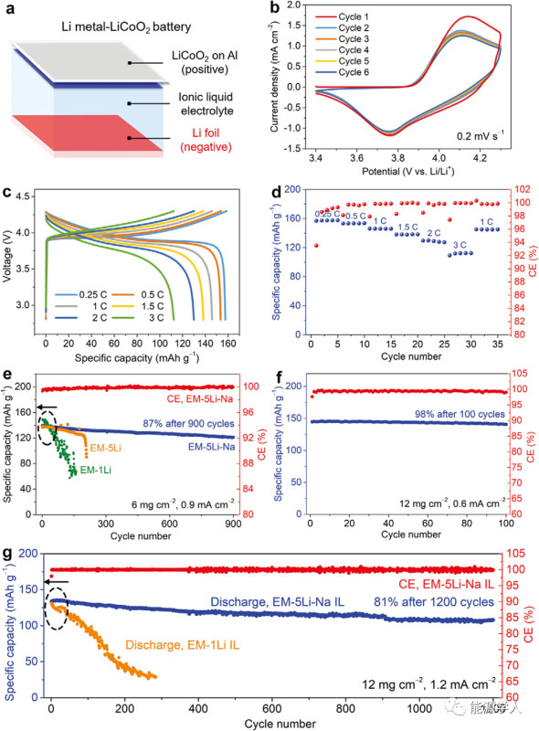 圖3 采用EM-5Li-Na - IL電解液的Li-LiCoO2電池的電化學(xué)性能。a) Li-LiCoO2電池結(jié)構(gòu)示意圖。b)采用 EM-5Li-Na IL電解液的Li-LiCoO2電池的CV曲線,掃描速率為2mv s?1。c) 使用EM-5Li-Na IL電解液的Li-LiCoO2電池在不同倍率下(0.25-3 C)的恒流充放電曲線。d) 使用EM-5Li-Na IL電解液的Li-LiCoO2電池的倍率性能。(b-d)中LiCoO2的載量為≈6 mg cm?2。e) 使用EM-1Li、EM-5Li和EM-5Li-Na IL電解液的Li-LiCoO2電池在1 C下的循環(huán)穩(wěn)定性曲線,LiCoO2的載量為≈6 mg cm?2。f)使用EM-5Li-Na IL電解液的Li - LiCoO2電池在0.35 C下的循環(huán)性能曲線,LiCoO2的載量為≈12 mg cm?2。g)分別采用EM-1Li和EM-5Li-NaIL電解液時Li-LiCoO2電池的循環(huán)性能曲線,LiCoO2的載量為≈12 mg cm?2,所有電池先在0.25 C下循環(huán)2次,隨后在0.7 C(≈1.2 mA cm?2) 下進行循環(huán)性能比較。