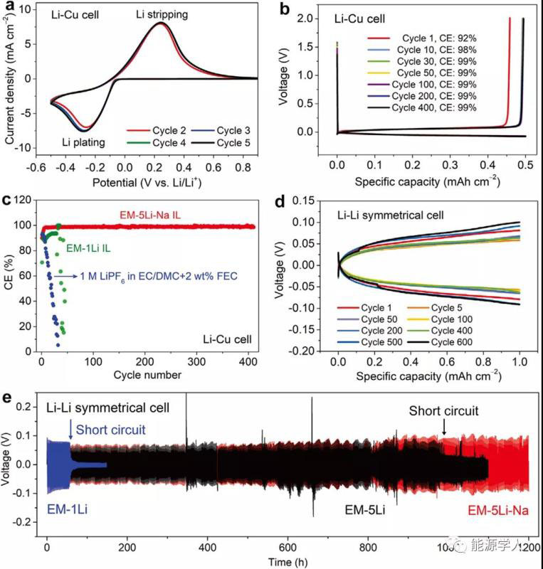 圖2 不同離子液體電解液的電化學(xué)性能。a)采用 EM-5Li-Na IL電解液的Li-Cu電池的CV曲線,掃描速率為2mvs?1。b) 使用EM-5Li-NaIL電解液的Li-Cu電池進行Li沉積/溶解時的充放電曲線。c)分別采用傳統(tǒng)有機電解液、EM-1Li和EM-5Li-Na IL電解液時Li-Cu電池中Li沉積/溶解的庫侖效率。(b,c)中電流密度和面積比容量分別為0.5 mA cm?2和0.5 mAh cm?2。d)使用EM-5Li-Na IL電解液的Li/Li對稱電池在不同循環(huán)次數(shù)下的Li沉積/溶解曲線。e)分別采用EM-1Li、EM-5Li和EM-5Li-Na IL電解液時Li /Li對稱電池的Li沉積/溶解曲線。(e,f)中電流密度和面積比容量分別為1 mA cm?2和1 mAh cm?2。
