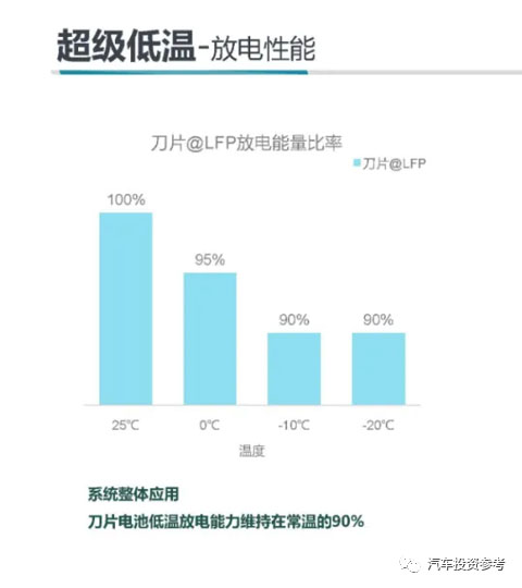 25℃是刀片電池最佳工作溫度,此時其放電能量比率為100%。隨著溫度的降低,這一比例將逐步下降;但在-10℃和-20℃時,都能穩(wěn)定在90%。