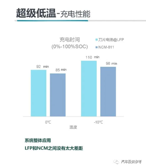 在-10℃的環(huán)境下,刀片電池能夠在110分鐘內從0充電至100%。同等情況下,NCM電池需要98分鐘。