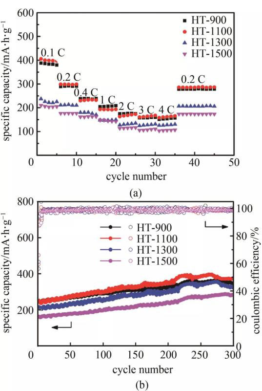 圖7(a)為菱角殼基硬炭電極的倍率性能圖。HT-900、HT-1100、HT-1300、HT-1500電極在0.2 C電流密度下的可逆比容量分別為284.9 mA·h/g、294.6 mA·h/g、211.2 mA·h/g、176.5 mA·h/g,當電流密度為4C時,可逆比容量能保持在159.9 mA·h/g、167.6 mA·h/g、131.2 mA·h/g、110.4 mA·h/g,容量保持率在56.12%、56.89%、62.12%、62.55%。大電流密度下,HT-900和HT-1100可逆比容量衰減較快,而HT-1300和HT-1500可逆比容量衰減的相對較少。當電流密度恢復到0.2 C時,HT-900、HT-1100、HT-1300、HT-1500的可逆比容量分別為278.1 mA·h/g、285.9 mA·h/g、206.8 mA·h/g、173.4 mA·h/g,容量保持率分別為97.61%、97.05%、97.92%、98.24%。由圖7(b)可知,HT-x電極在0.4 C電流密度循環(huán)300次時,可逆比容量隨循環(huán)次數(shù)增加先增大之后趨于穩(wěn)定,容量的增加可能來源于鈉離子的嵌入和脫出對電極材料的活化,其中HT-900和HT-1100可逆比容量相近,且均高于其他兩個樣品。