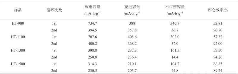 由圖4可知,HT-x樣品的N2吸脫附曲線為IV型,首先在低壓區(qū)就有一定吸附,相對壓力接近1.0時,吸附量迅速增加,脫附曲線和吸附曲線形成遲滯回線,表明樣品中包含介孔和大孔結構。在相同壓力下,HT-900的N2吸脫附量高于其他三個樣品,且從孔徑分布圖可以看出其孔徑主要分布在0.8~1.2 nm,說明HT-900的比表面積相對較大,且包含了較多的微孔結構。由4(a)中的N2吸脫附測試曲線計算可以得到HT-900、HT-1100、HT-1300、HT-1500樣品的比表面積分別為300.94 m2/g、76.82 m2/g、68.29 m2/g、56.71 m2/g。由4(b)孔徑分布圖可以看出,HT-x樣品具有連續(xù)的孔分布,包含微孔、介孔和大孔,這樣的孔結構有利于鋰離子的儲存和擴散。表2列出了HT-x的元素含量,隨著炭化溫度的升高,碳元素含量逐漸增加,而氧、氮、氫含量逐漸降低,表明隨炭化溫度升高,石墨微晶結構中的官能團和缺陷進一步減少,有序度增加。