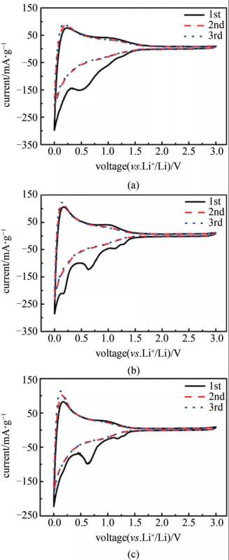 圖5為菱角殼基硬炭電極在0.1 mV/s掃速下的CV曲線。首次循環(huán)過程中,0~1.25 V范圍內出現(xiàn)的還原峰對應SEI膜的生成。0 V左右的氧化峰的電壓大于還原峰的電壓,這是由于鋰離子儲存在硬炭材料中的微孔中時,會在單層碳兩邊和納米微孔周圍發(fā)生吸脫附,近似為金屬態(tài)。第2圈的CV曲線與第3圈基本重合,說明容量衰減主要在首次循環(huán)過程中,后續(xù)循環(huán)過程容量基本不發(fā)生衰減。