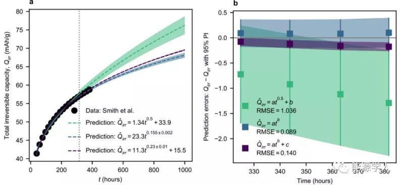 SEI生長模型的一個常見用途是預測電池壽命,這本質上是一個時間序列預測問題。對于這個用途,函數(shù)形式的選擇對于準確的預測是至關重要的。評價候選模型預測能力的一種簡單方法是將初始數(shù)據(jù)擬合,并將最后的幾個點作為一個測試集,然后比較各個模型之間測試集的均方根誤差(RMSE)。如圖4,Smith等人已經將這種方法應用于壽命預測。選擇該系列進行分析,以說明在不與多個模型進行比較的情況下使用t0.5進行預測的不可靠性。圖4a中展示了更長時間的外推趨勢線,顯示了t0.5如何高估了冪律模型所估計的衰減。t0.5模型在1000 h時的額外預測總不可逆容量(Qirr)比兩項冪律模型大66%。這些經典的預測區(qū)間只考慮隨機誤差項的不確定性,而不考慮參數(shù)估計,因此可能低估了誤差。為了從經驗上確定數(shù)據(jù)集的合適函數(shù)形式,再次建議使用殘差分析。殘差沒有系統(tǒng)趨勢的擬合具有較低的偏差,這對于長時間的準確預測尤為重要。進一步研究了適用于Smith等人工作的所有被考慮的函數(shù)形式,但其殘差中都表現(xiàn)出一種系統(tǒng)的趨勢;而且t0.5模型是本系列中性能最差的候選函數(shù)形式。在循環(huán)過程中的SEI生長預計不會遵循t0.5模型,因此在殘差沒有系統(tǒng)趨勢的情況下確定一個合適的模型可能具有挑戰(zhàn)性。