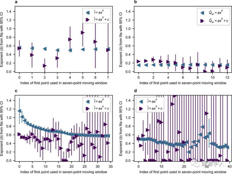 從理論上講,SEI可能會隨著薄膜的生長而在時間尺度上發(fā)生轉變,這些類型的轉變在氧化文獻中很常見。事實上,即使是最簡單的表面膜生長模型(如Deal-Grove),最初的反應也局限于較低的膜厚度(一階反應具有線性時間依賴性)。對第一周期SEI生長的實驗測量表明,過電位是速率的指數(shù)函數(shù),這表明了Butler-Volmer動力學和表面反應動力學對SEI的初始限制。如圖11,將7個相鄰點同時擬合到兩個冪律表達式中,以檢驗擬合指數(shù)與四個系列中循環(huán)數(shù)的函數(shù)的相關性。在除一個系列之外的所有系列中,使用任何一個模型,指數(shù)都保持相當恒定。這一結果表明,至少在這四個數(shù)據(jù)系列中,SEI的時間依賴性在第一個循環(huán)之后不會發(fā)生重大轉變。