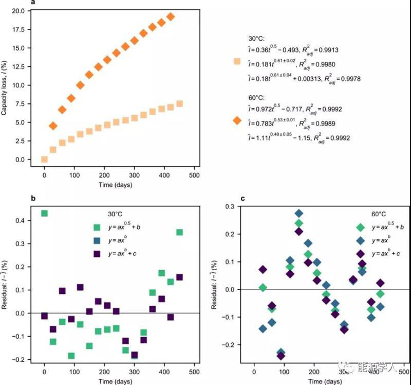 這項工作回顧了鋰離子電池SEI生長的t0.5模型的理論和實驗依據(jù)。從理論上講,t0.5模型只在穩(wěn)態(tài)生長時成立(即在儲存期間大致成立),但在典型的充放電循環(huán)期間很少成立。SEI生長的復雜性也不適合用簡單的比例關系擬合。根據(jù)經驗,這項工作研究的17個系列中,有16個系列的t0.5模型在統(tǒng)計上是不合理的。最后,研究人員發(fā)現(xiàn)冪律指數(shù)在不同的數(shù)據(jù)集中是相對穩(wěn)定的。研究人員建議對多個模型(不限于冪律模型)進行比較,并通過殘差分析進行評估——既可用于科學地說明SEI生長的時間依賴性,也可用于推斷壽命預測應用中的容量衰減數(shù)據(jù)。