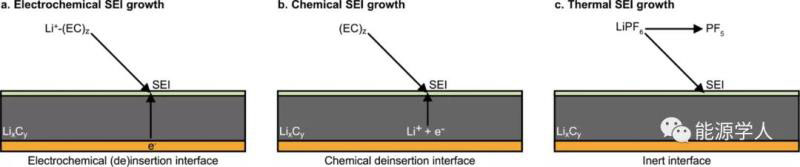通常,t0.5依賴關系是擴散受限過程的特征,對于SEI生長,通常考慮兩個主要的限速傳輸物質:電子在電解液/SEI界面(“外部”SEI生長)或溶劑/鹽陰離子在SEI/電極界面(“內部”SEI生長)反應。如果限速物質帶電(如電子),除了擴散外,還必須考慮更復雜的輸運方式,如遷移。因此,SEI的生長不太可能僅僅受到擴散的限制,尤其是在不同的時間和長度尺度上。根據(jù)鋰離子和電子的來源和吸收,SEI的生長可以分為三種生長模式:電化學、化學和熱學(圖1)。