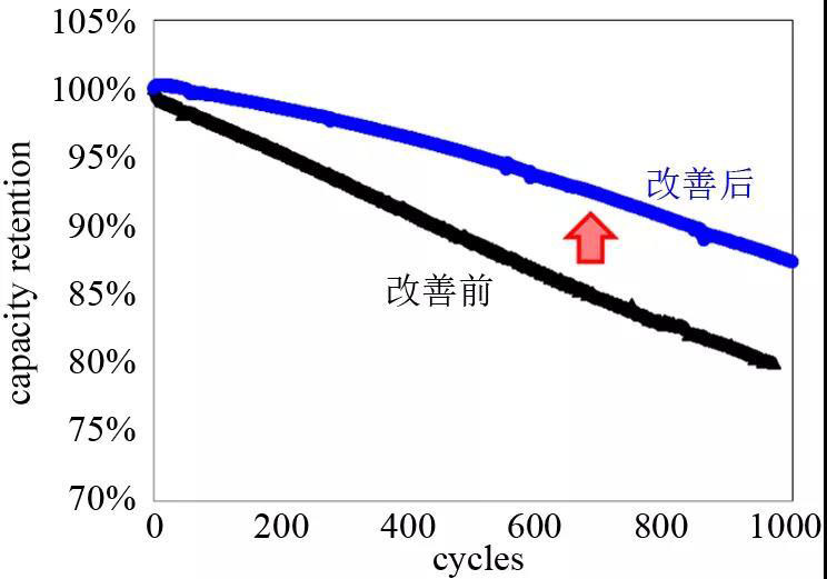圖8 正極改善前后45 ℃循環(huán)曲線