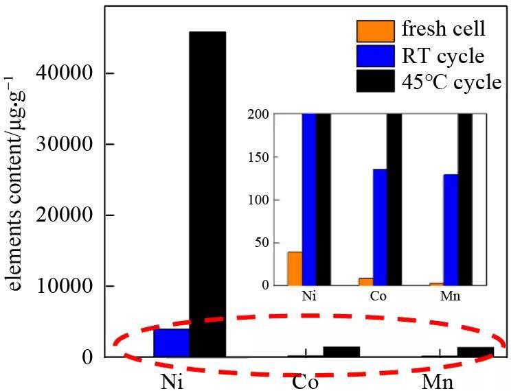 鋰離子電池正極材料過渡金屬溶出并沉積在負(fù)極是電池容量衰減的一大原因。因此對(duì)循環(huán)前后的負(fù)極刮粉,利用ICP對(duì)負(fù)極片沉積的主元素進(jìn)行了測(cè)試。結(jié)果證明循環(huán)后負(fù)極片上沉積的主元素含量顯著增多,尤其是高溫循環(huán)后過渡金屬溶出含量大幅增長(zhǎng)。而正極材料中的過渡金屬溶解,會(huì)經(jīng)電解液擴(kuò)散到負(fù)極表面然后發(fā)生還原反應(yīng),破壞負(fù)極SEI膜導(dǎo)致其持續(xù)生長(zhǎng),導(dǎo)致活性Li 損失和電池阻抗的增加。近日華南師范大學(xué)的Wang等[4]研究表明,二價(jià)Mn元素溶解在電解液中時(shí),由于其獨(dú)特的溶劑化結(jié)構(gòu)會(huì)對(duì)碳酸酯溶劑和六氟磷酸根造成嚴(yán)重的破壞,從而造成鋰離子電池性能的持續(xù)衰減。