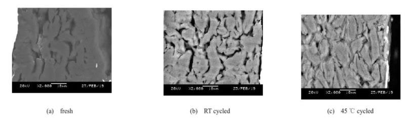 SEM電鏡照片表明,正極材料循環(huán)后出現(xiàn)了大面積明顯的微裂紋乃至裂紋,高溫循環(huán)后的材料更是出現(xiàn)了嚴(yán)重的粉化現(xiàn)象。這主要是由于在反復(fù)充放電過程中,晶胞不斷地膨脹收縮,導(dǎo)致正極材料顆粒結(jié)構(gòu)斷裂、粉化,致使活性粒子之間接觸不良,增加電池內(nèi)阻,并且材料比表面積增加,加劇了與電解液的副反應(yīng),導(dǎo)致材料失效。而在高溫循環(huán)后,負(fù)極表面的SEI膜也顯著增厚,造成Li+的消耗及電池內(nèi)阻的增長(zhǎng)。